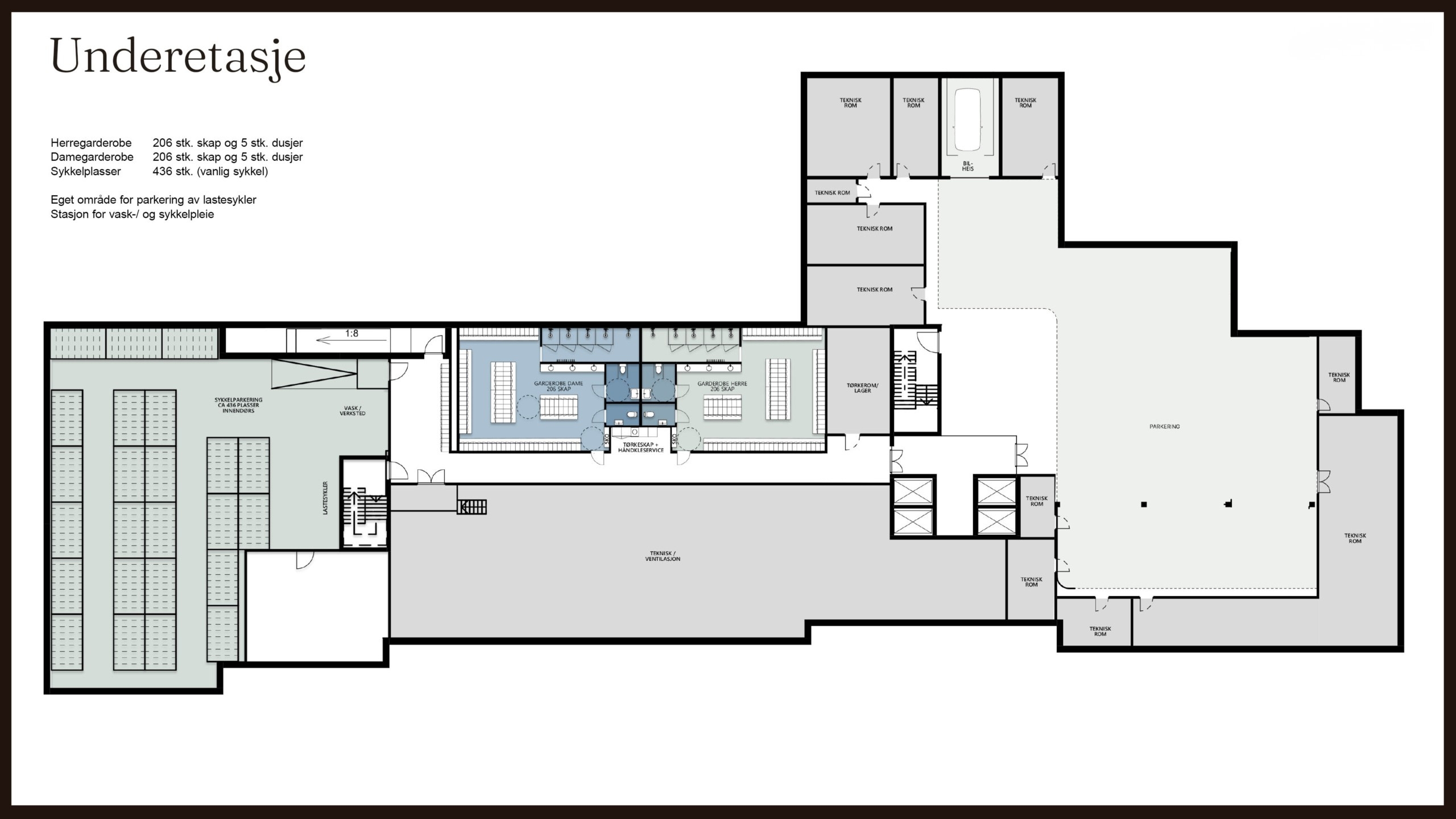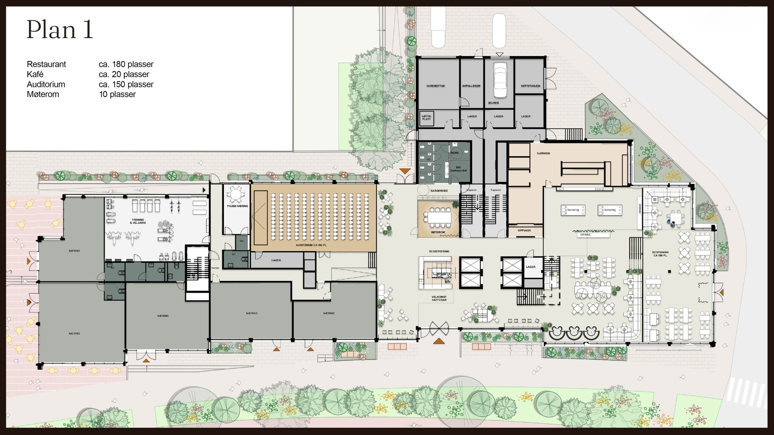 Første etasje er for utadrettede virksomheter, bedriftsresturant og auditorium, mens 2-9 etasje består i hovedsak av rene kontoretasjer.