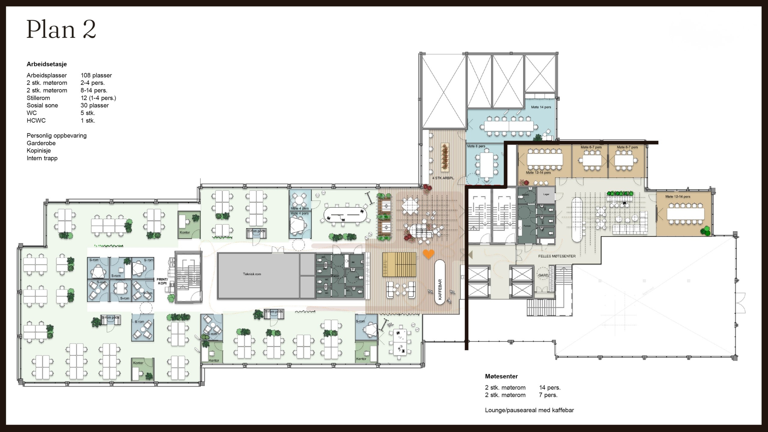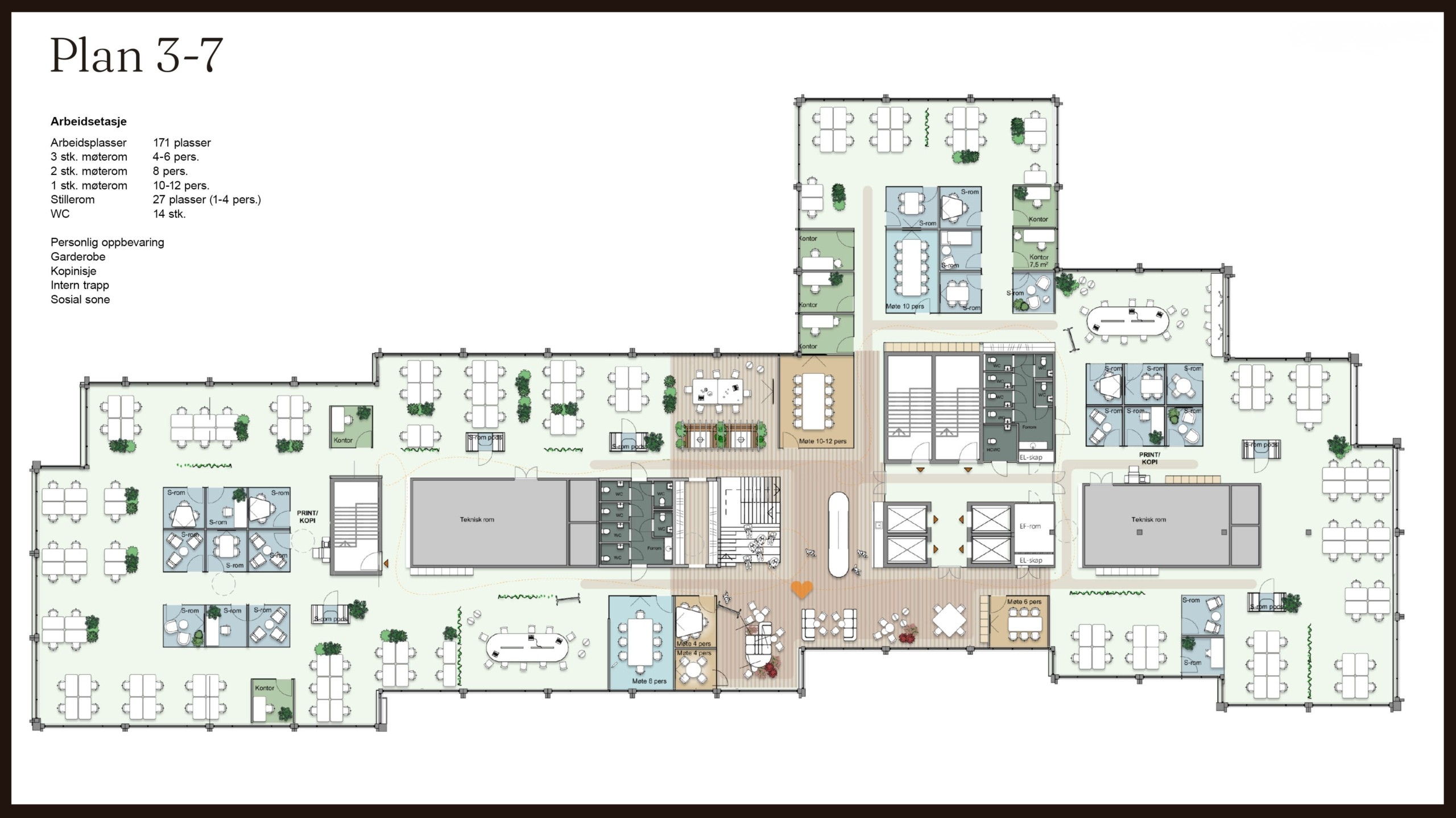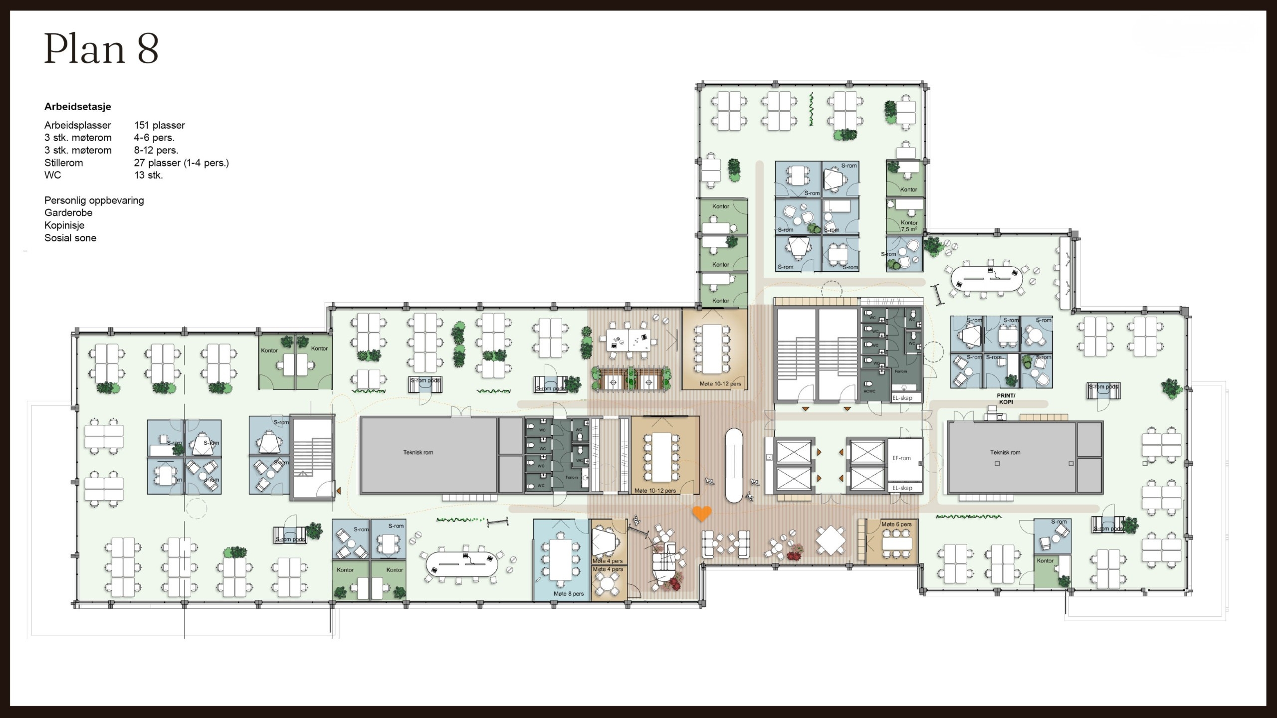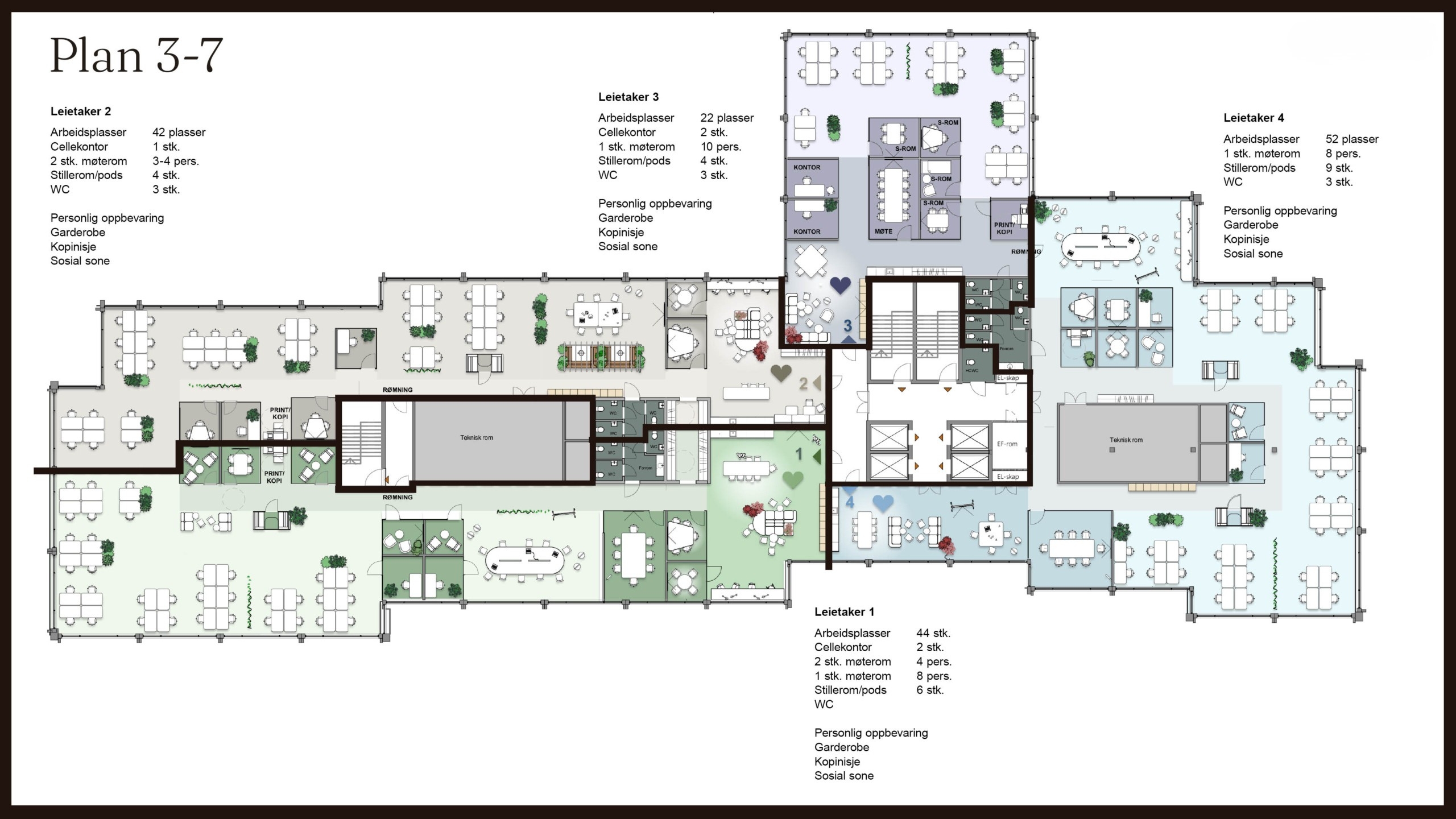 Hvert etasjeplan er på vel 2700 kvadratmeter, noe som betyr at hvert plan kan gi inntil 170 arbeidsplasser. Hver etasje kan deles inn i fire mindre lokaler, noe som betyr at dere i Vitaminen kan leie arealer fra 500 til 2700 kvadratmeter per plan. God internkommunikasjon mellom etasjene gjør at bygget også er svært godt egnet for leietakere med større arealbehov – og til og med som et enbrukerbygg vil Vitaminen fungere svært godt.